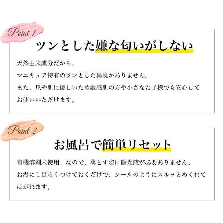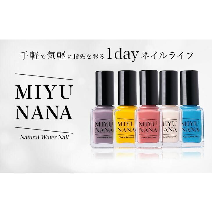 ○MIYUNANAは40℃以上のお湯で簡単にオフできる、爪にやさしい水性ネイルです。