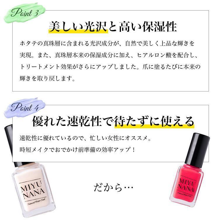 ○MIYUNANAは40℃以上のお湯で簡単にオフできる、爪にやさしい水性ネイルです。