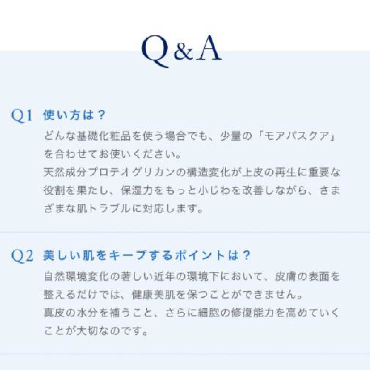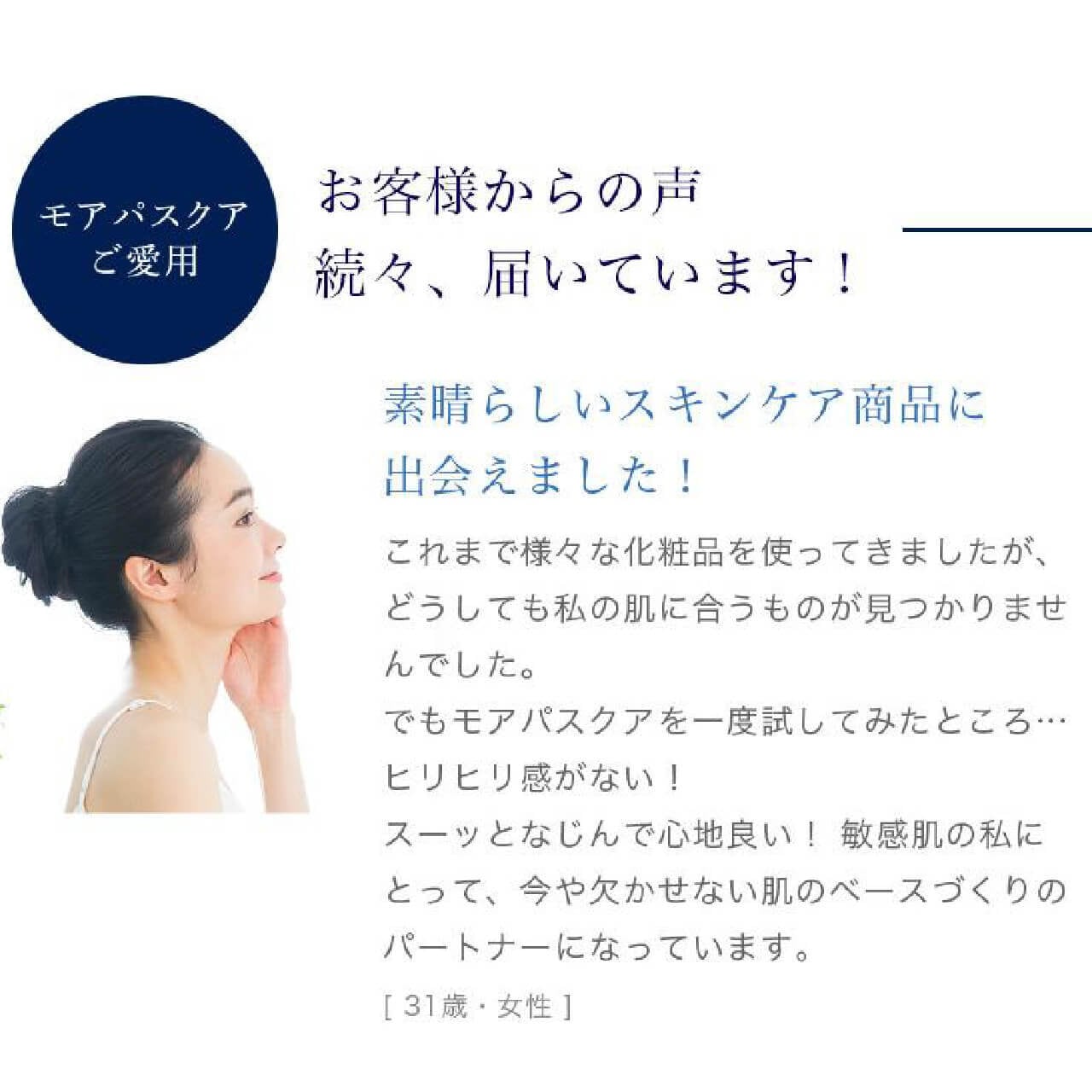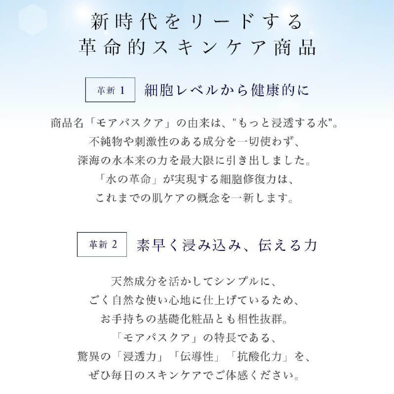 【商品説明】モアパスクアの由来は“もっと浸透する水”不純物や刺激性のある成分を一切使わず深海の水本来の力を最大限に引き出しました。「水の革命」が実現する細胞修復力はこれまでの肌ケアの概念を一新します。